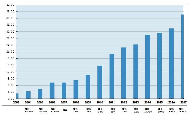 数据分析图一:《开云网页版登录入口-开云online(中国) 公司2003-2017年营业额数据图》(单位:亿元)